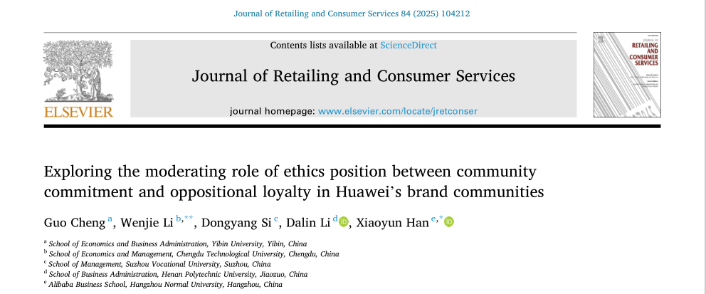 近日,我校程果博士團隊在品牌社區與對抗性忠誠研究領域取得重要進展。團隊相關研究成果以“Exploring the Moderating Role of Ethics Position between Community Commitment and Oppositional Loyalty in Huawei’s Brand Communities”(華為品牌社區中道德立場在社區承諾與對立忠誠之間調節效應的探討)為題,被國際知名 SSCI 期刊《Journal of Retailing and Consumer Services》(《零售和消費者服務雜志》)收錄,這標志著我校在品牌社區管理與道德消費領域的研究水平持續提升。據悉,該期刊2024年最新影響因子為11.0,SSCI分區排名8/302,是中科院管理學大類一區Top期刊,位于JCR一區。