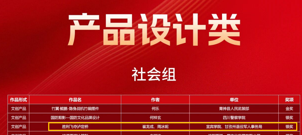 近日,四川省首屆“愛我國防”文化創意大賽獲獎作品公布,我校藝術設計學院教師崔龍成與甘孜州退役軍人事務局共同創作的作品《勝利飛奪瀘定橋》獲產品設計類銀獎;藝術設計學院學生宋婉婷、張穎的作品《蜀道征途一飛行棋》(指導老師余俊言),學生李浩洋的作品《“國之脊梁,星耀兩彈”紅色文化系列印章》(指導老師崔龍成)分別獲產品設計類優秀獎。