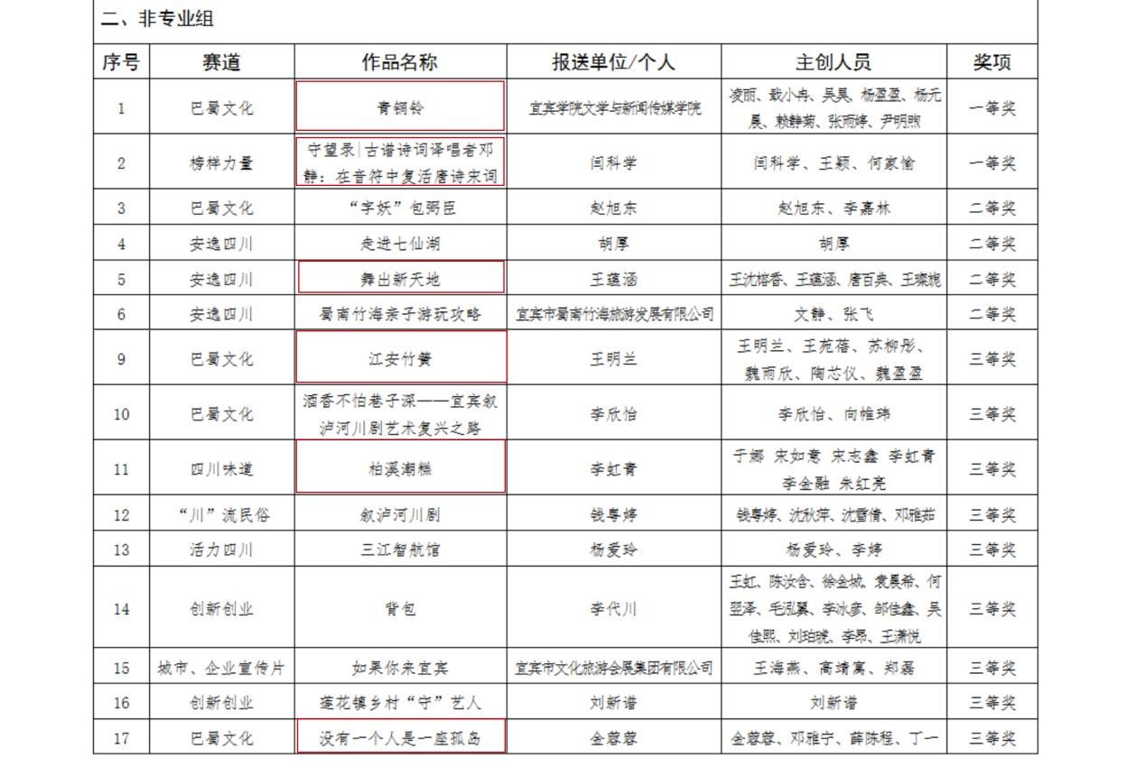 本次活動圍繞和美鄉村、巴蜀文化、安逸四川、四川味道、“川”流民俗、活力四川、開放四川、榜樣力量、創新創業、人工智能活動、城市及企業宣傳片等主題展開。經過嚴格評審,在非專業組,宜賓學院的《守望錄|古譜詩詞譯唱者鄧靜:在音符中復活唐詩宋詞》《青銅鈴》榮獲一等獎,《舞出新天地》榮獲二等獎,《江安竹簧》《柏溪潮糕》《沒有一個人是一座孤島》榮獲三等獎。