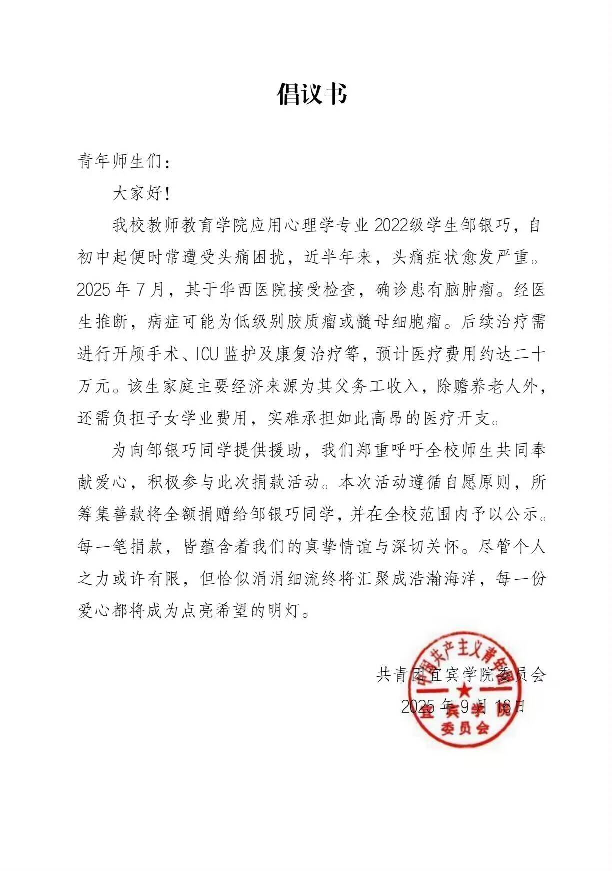 近日,宜賓學院教師教育學院家庭經濟困難畢業生鄒銀巧確診腦腫瘤,高額醫療費用致她陷入困境,為幫助患病學生順利進行治療,學校團委第一時間響應并高度關切,迅速行動,面向全校師生發起倡議進行募捐。