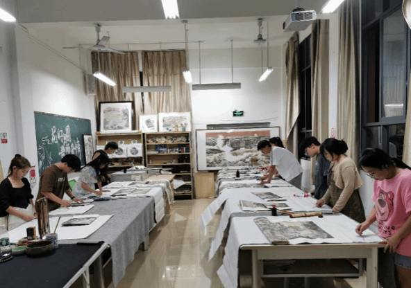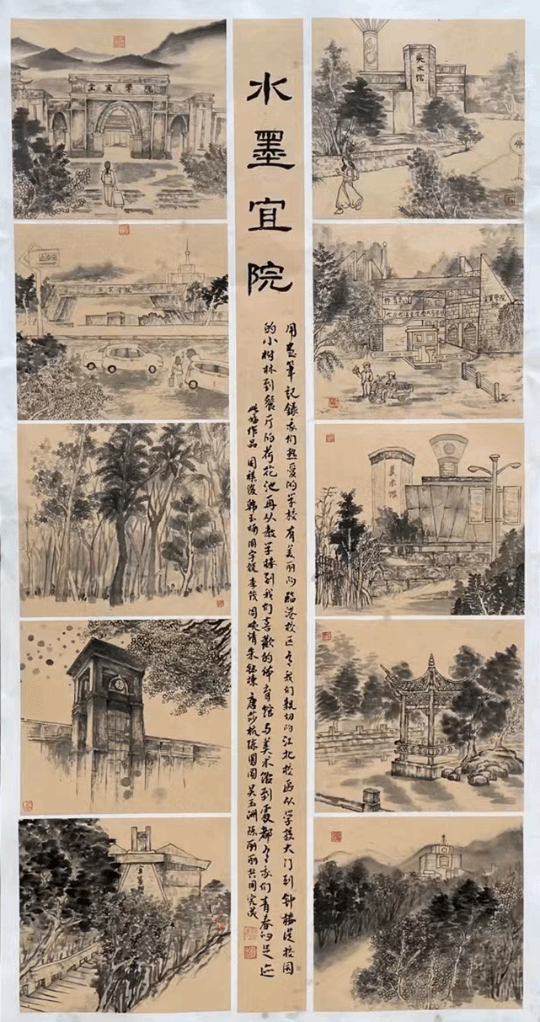 《水墨宜院》創作內容,以熟悉的校園文化為切入點,讓學生在學好專業技能的同時,培養家國情懷,完善人格修養,充分發揮作品以文化人,以文育人的作用,引導學生牢記殷殷囑托,做新時代好青年。宜賓學院學子用毛筆記錄他們自己熱愛的校園,從學校大門到教學樓,從一平臺的小樹林到二平臺的荷花池,從充滿青春活力的體育館到藝術的搖籃美術館......學子們同心協力,既發揮了專業特長,又用中國畫方式謳歌了自己生活和學習的地方。
