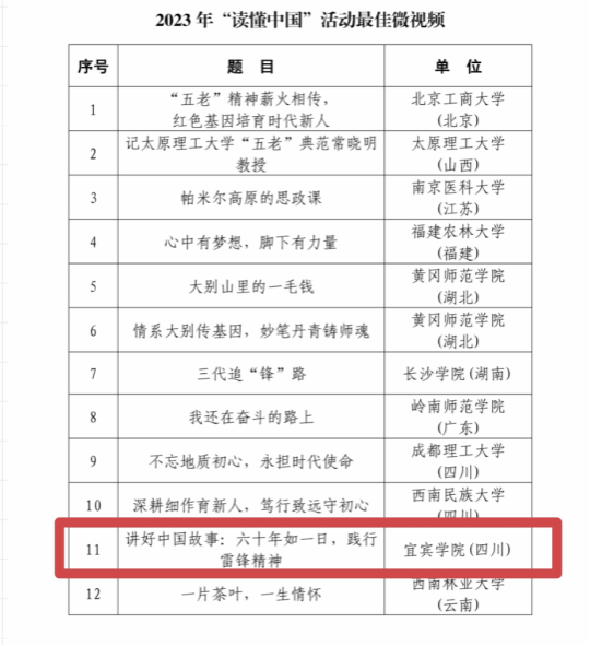 自活動(dòng)開展以來,宜賓學(xué)院關(guān)工委積極參與,認(rèn)真籌備,在全校范圍開展作品征集,共收到征文67篇,微視頻23個(gè),經(jīng)過綜合評(píng)議,優(yōu)中選優(yōu),推選1個(gè)微視頻作品——《講好中國故事:六十年如一日,踐行雷鋒精神》參評(píng),成功入選2023年“讀懂中國”活動(dòng)最佳微視頻(全國僅30個(gè)入選)。宜賓學(xué)院關(guān)工委受到教育部表揚(yáng)(全國共175個(gè)省屬及其他部委所屬院校關(guān)工委受表揚(yáng)。