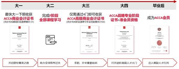 財務管理ACCA科學安排大學四年ACCA課程學習與考試進度,學生可穩步提升專業技能水平,收獲全球名企、名校認可的ACCA各階段執業資格證書,就業、升學更具優勢。