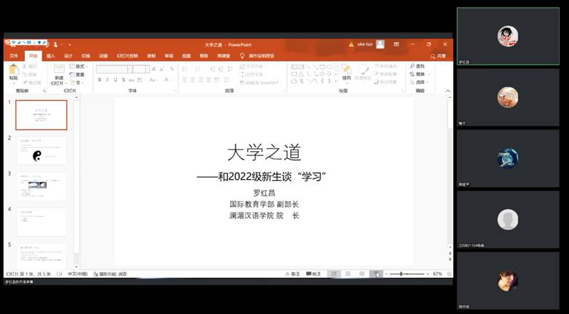 此次2022級新生線上入學教育主要包括:宜賓學院校情校史、勵志教育、創新學習、涉外安全與國際視野、安全文明健康成長教育、學生工作介紹、專業教育、班級教育等內容。國際教育學部黨政領導干部、學工辦老師、輔導員和2022級新生參加了本次新生入學教育。