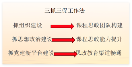 推進(jìn)“三抓三促”黨支部工作法,旨在解決外語人才培養(yǎng)中思想政治教育薄弱的問題。該工作法通過抓黨支部組織建設(shè),促進(jìn)課程思政團(tuán)隊構(gòu)建;通過抓思想政治建設(shè),促進(jìn)教師課程思政能力提升;通過抓黨建平臺建設(shè),促進(jìn)思政教育渠道暢通。