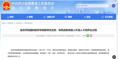 推進(jìn)“三抓三促”工作法,強化了黨建對外語人才思想政治教育的引領(lǐng),真正把黨組織的領(lǐng)導(dǎo)力和組織力轉(zhuǎn)化為推進(jìn)人才培養(yǎng)中心工作的強大動力。2021年,黨支部“舉黨建之大旗 育民族之桃李”工作案例獲評為宜賓學(xué)院“建黨100周年”黨支部工作創(chuàng)新案例。2022年,四川省教育廳官網(wǎng)以“將思政教育融入外語人才培養(yǎng)全過程”對此作了全方面的報道。黨支部組建課程思政團(tuán)隊,開展“四史學(xué)習(xí)教育進(jìn)教案” “《習(xí)近平談治國理政》進(jìn)課堂”等系列活動組織化推進(jìn)課程思政工作,立項課程思政項目10余項。
