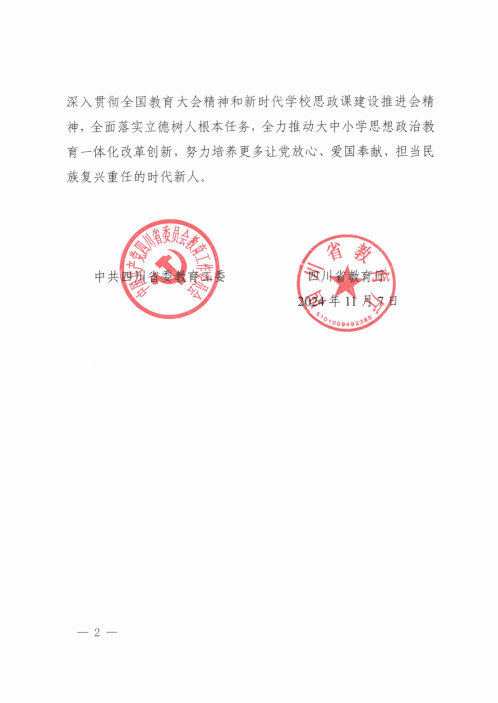 近日,中共四川省委教育工作委員會(huì)、四川省教育廳向我校發(fā)來一封感謝信,對(duì)學(xué)校在“2024年四川省大中小學(xué)思政教育秋季開學(xué)第一課”專題節(jié)目中的大力支持及我校師生的辛勤付出致以誠(chéng)摯感謝。