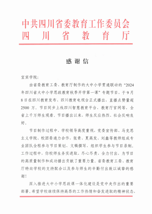 感謝信中指出,由省委教育工委、教育廳制作的大中小學(xué)貫通聯(lián)動(dòng)的“2024年四川省大中小學(xué)思政教育秋季開學(xué)第一課”專題節(jié)目于9月8日在四川教育發(fā)布、四川教育電視臺(tái)正式播出,并同步上線四川智慧教育平臺(tái)、教育廳官網(wǎng)等。節(jié)目播出以來,師生反應(yīng)熱烈、社會(huì)反響良好。節(jié)目制作過程中,宜賓學(xué)院領(lǐng)導(dǎo)高度重視,黨委宣傳部、馬克思主義學(xué)院、校團(tuán)委通力合作,張青、夏高發(fā)、劉鑫等教師組成專業(yè)團(tuán)隊(duì)全程參與節(jié)目策劃、文稿撰寫,組織學(xué)生參與節(jié)目錄制,為節(jié)目的高質(zhì)量制作和成功播出貢獻(xiàn)了重要力量。